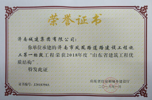 濟南市鳳凰路道路建設工程施工第一標段工被評為2018年度“山東省建筑工程優質結構”