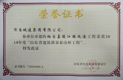 煙臺嘉陵江路改造工程被評為2018年度“山東省建筑質量泰山杯工程”