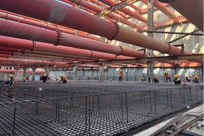質量管控方面,項目部實行全過程精細化管理。鋼筋工程嚴格執行圖紙要求,對型號、間距、搭接等關鍵參數逐一驗收;混凝土澆筑采用串筒工藝保障澆筑質量,技術人員全程旁站監督,定時檢測坍落度指標。振搗作業遵循標準化流程,對關鍵部位加強振搗力度。混凝土初凝前實施二次抹壓工藝,有效提升結構自防水能力。經過70個晝夜的連續施工,項目部高質量完成全部23節底板的封底任務。