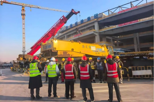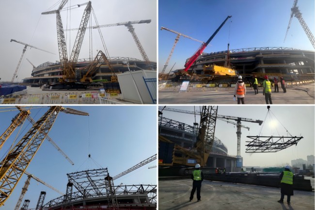 1月29日,項目順利完成800噸級履帶吊安裝工作,為后續大噸位構件吊裝創造有利條件。2月1日,首批懸挑桁架完成吊裝,標志著屋蓋鋼結構施工正式進入關鍵攻堅階段,對后續區域施工起到示范和引領作用。